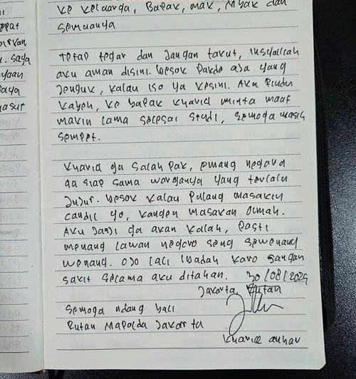 PEKANBARU (BabadNews) - Khariq Anhar, mahasiswa Fakultas Pertanian Universitas Riau (UNRI), kini mendekam di Rutan Polda Metro Jaya usai ditetapkan tersangka kasus dugaan pelanggaran UU ITE. Dari balik jeruji, ia menulis surat menyentuh hati yang berisi kerinduan dan permintaan maaf kepada keluarganya.Dari balik jeruji besi, Khariq mengirimkan surat yang menyentuh hati, berisi permohonan maaf dan kerinduan mendalam kepada keluarganya.Penangkapan Khariq terjadi saat ia hendak kembali ke