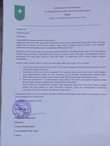 PEKANBARU (BabadNews) - Warga RW 04 Kelurahan Muara Fajar Timur, Kecamatan Rumbai Barat, Kota Pekanbaru, mendesak pemerintah menutup Tempat Pembuangan Akhir (TPA) Muara Fajar. Mereka menilai keberadaan TPA lebih banyak menimbulkan dampak negatif, mulai dari kerusakan jalan, bau menyengat, hingga minimnya pemberdayaan masyarakat sekitar.Permintaan ini dituangkan melalui surat yang ditujukan kepada Polsek Rumbai dan ditembuskan ke Camat Rumbai Barat serta Lurah Muara Fajar Timur, tertanggal 30