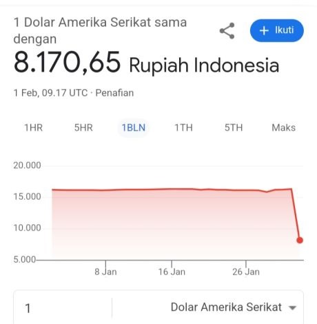 JAKARTA (BabadNews) – Jagat media sosial dihebohkan dengan penampakan nilai tukar dolar Amerika Serikat (AS) yang tiba-tiba anjlok menjadi Rp8.170 per dolar di Google Finance. Fenomena ini membuat warganet berspekulasi liar, sementara Bank Indonesia (BI) buru-buru membantah keakuratan data tersebut.Pada Jumat (31/1/2025), kurs rupiah terhadap dolar AS sebenarnya tercatat di Rp16.355, namun linimasa media sosial mendadak dipenuhi tangkapan layar yang menunjukkan angka jauh lebih rendah.